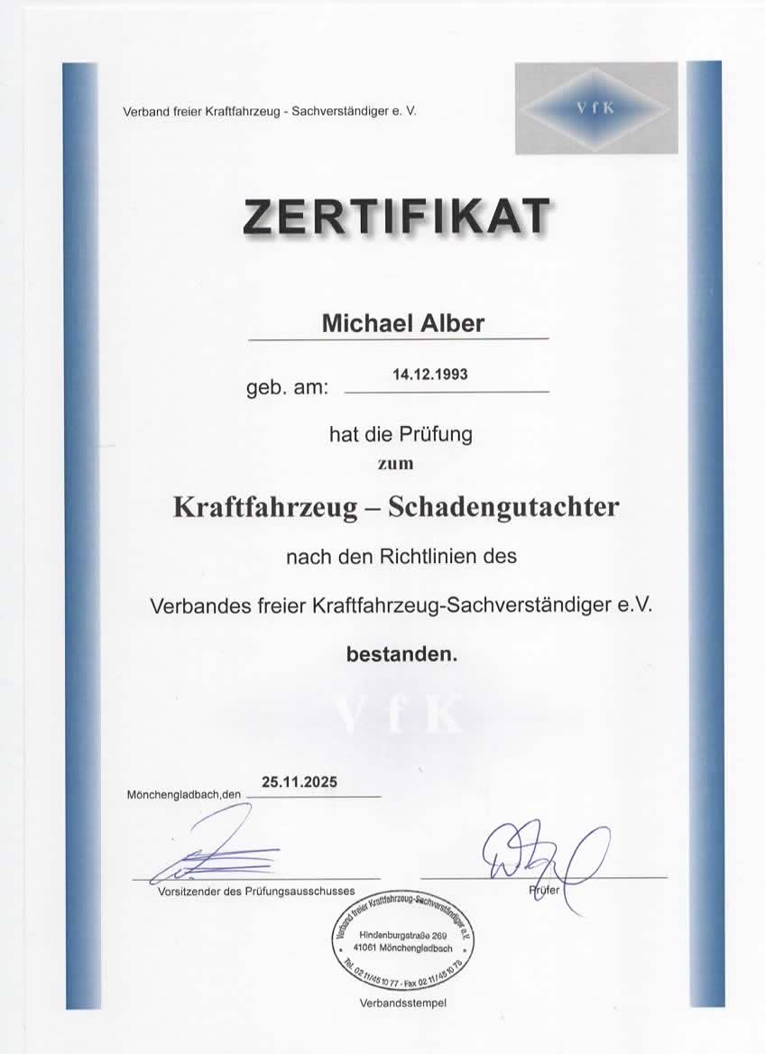 Ich bin geprüfter Sachverständiger des Vfk e.V. und Mitglied im Verband freier Kraftfahrzeug-Sachverständiger e.V.